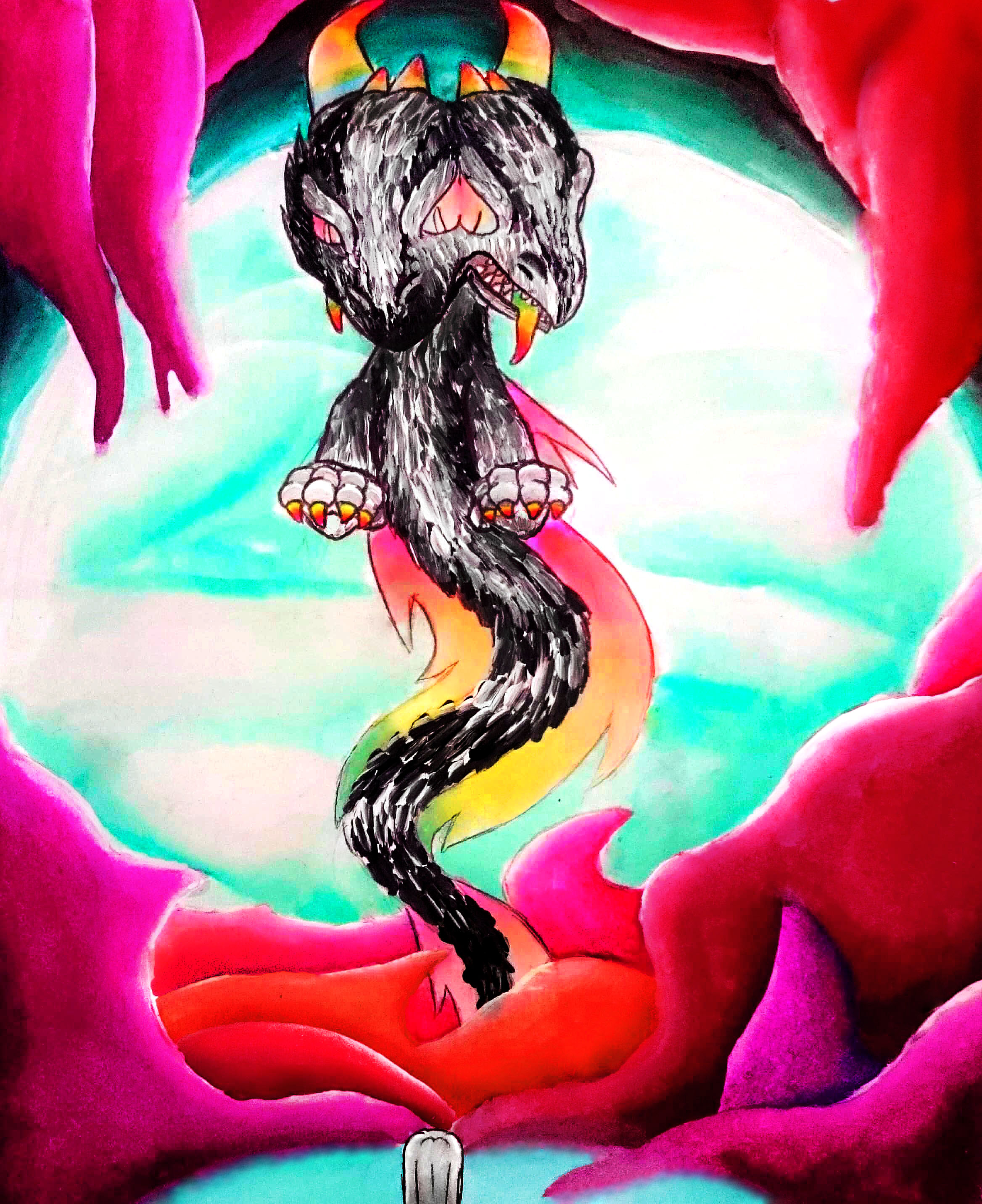 A monochrome dragon guards the rainbow nebulae of the Realmless,